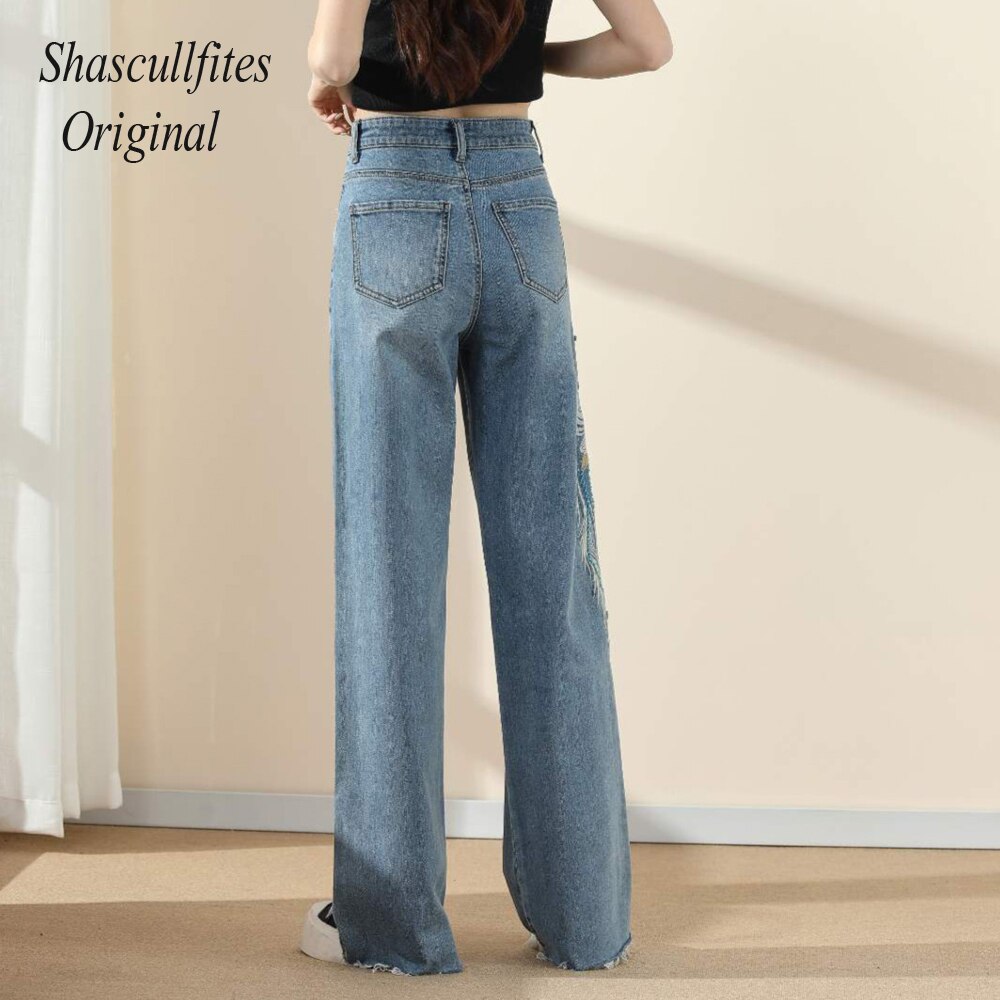 OR05 Shascullfites Original Embroidery Straight Loose Blue Women Jeans Wide Leg Fashion Pants Over Size Jeans